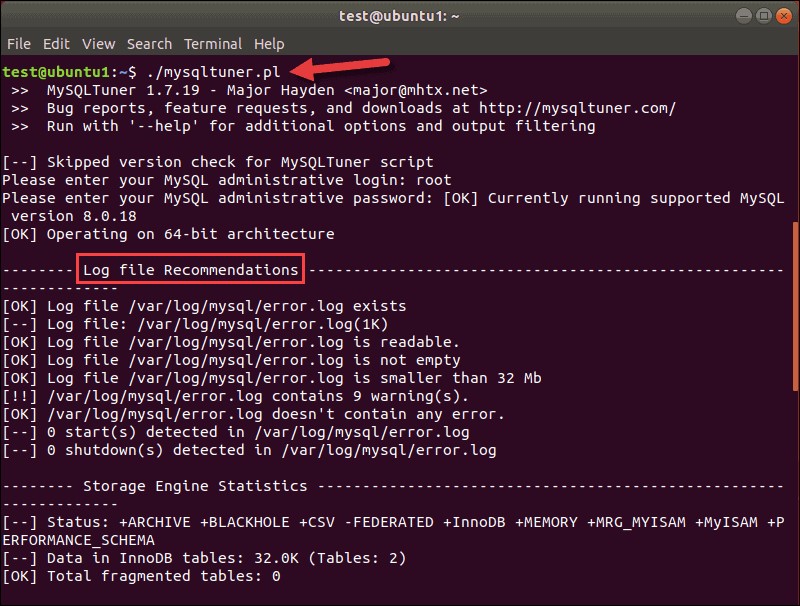 在輸出的頂部,您可以看到 MySQLTuner 工具和您的數(shù)據(jù)庫的版本。